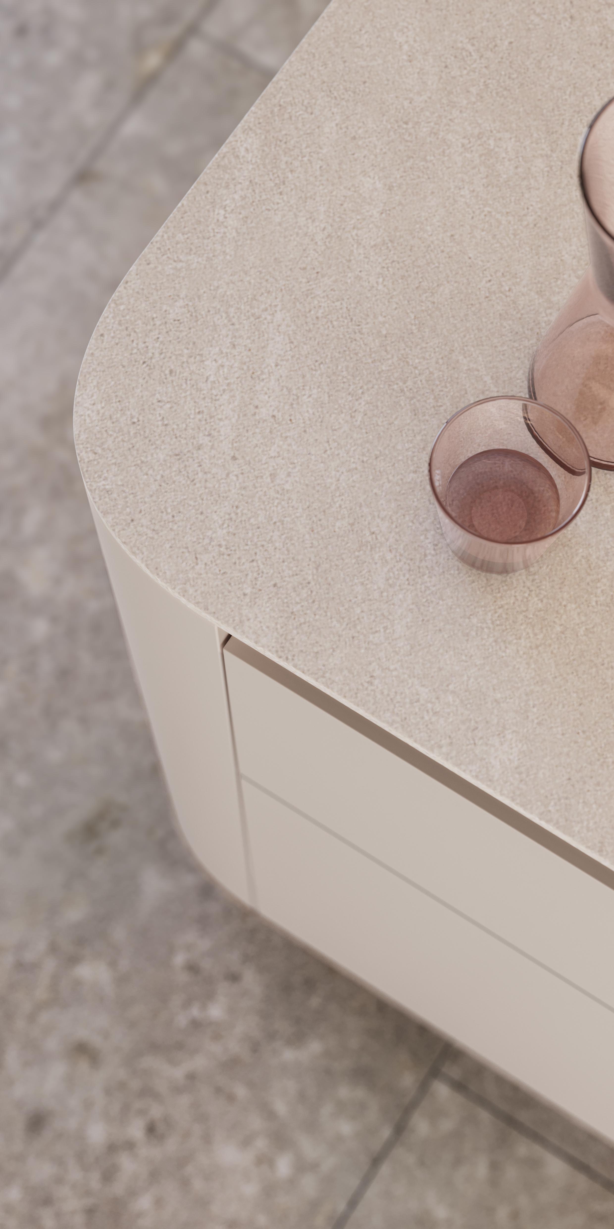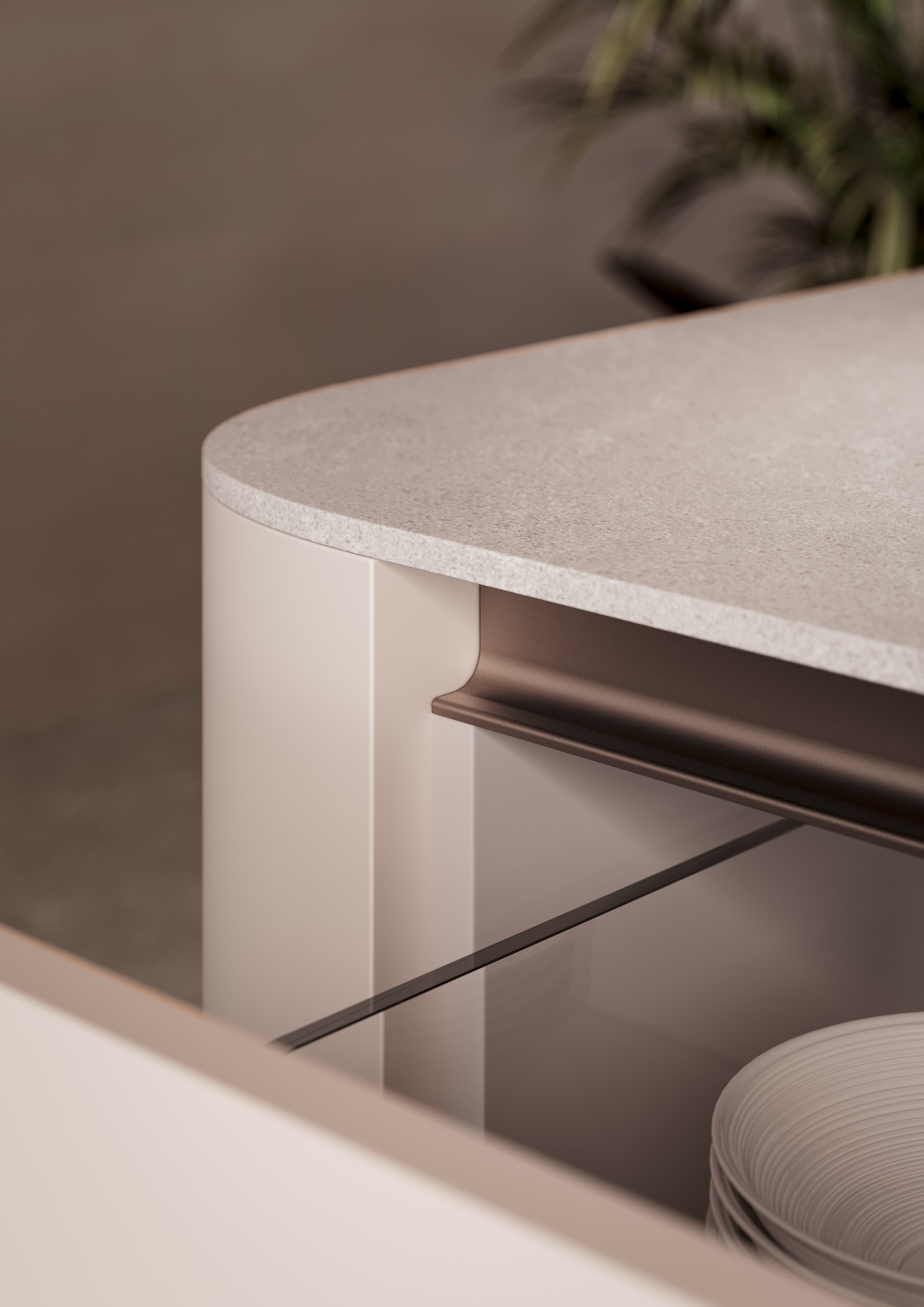 Typisch für LEICHT ist die hochwertige Verarbeitung bis ins kleinste Detail: Die Innenseiten der Wangen passen sich den sichtbaren Frontseiten in höchster Präzision an, zugleich unterstreicht eine Arbeitsplatte aus Kompaktmaterial die stilvolle Optik durch natürlich wirkende Einschlüsse und lebendige Strukturen. Großzügige Radien an den Ecken der Platte schließen bündig mit der gebogenen Silhouette ab. Neben Arbeitsplatten tragen auch abgerundete Abdeckböden und Tischplatten zur skulpturalen Wirkung der Möbel bei.