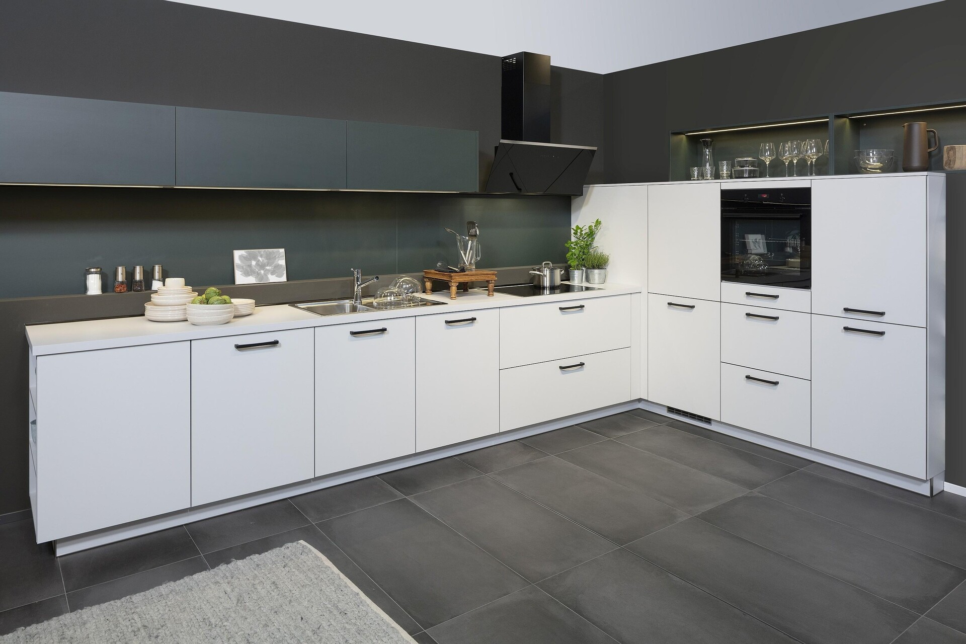 Was aber, wenn man den Stauraum der Oberschränke braucht? Die Lösung ist, die Oberschränke optisch zu verbergen. Das Küchenbeispiel zeigt, wie's geht: Mit einer zweifarbigen Gestaltung, bei der die Unterschränke am besten in Weiß und die Oberschränke in einem sehr dunklen Farbton und ohne Griffe gestaltet sind. In diesem Fall handelt es sich um die Farbe Blackgreen. Der entscheidende Clou ist natürlich, dass die Wand dahinter in genau derselben Farbe gestrichen ist. Dadurch verschwinden die Oberschränke beinahe im Hintergrund. Der Effekt ist frappierend, nicht wahr?!
