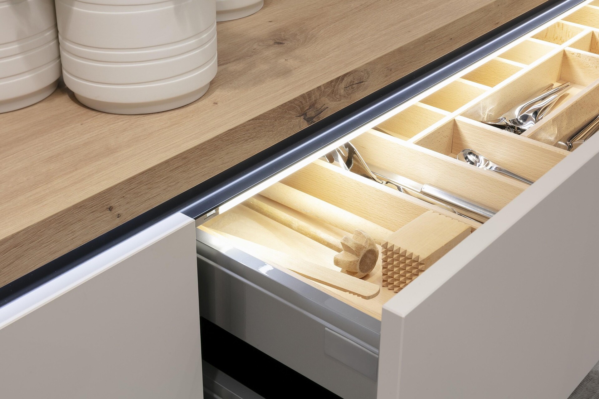 Sieht nicht nur schön aus, ist auch noch äußerst praktisch: Schubladenbeleuchtung, die beim Aufziehen der Lade bewegungsaktiviert angeht und beim Schließen wieder abschaltet. Auf diese Weise haben Sie sofort einen klareren Blick für das was drin ist.