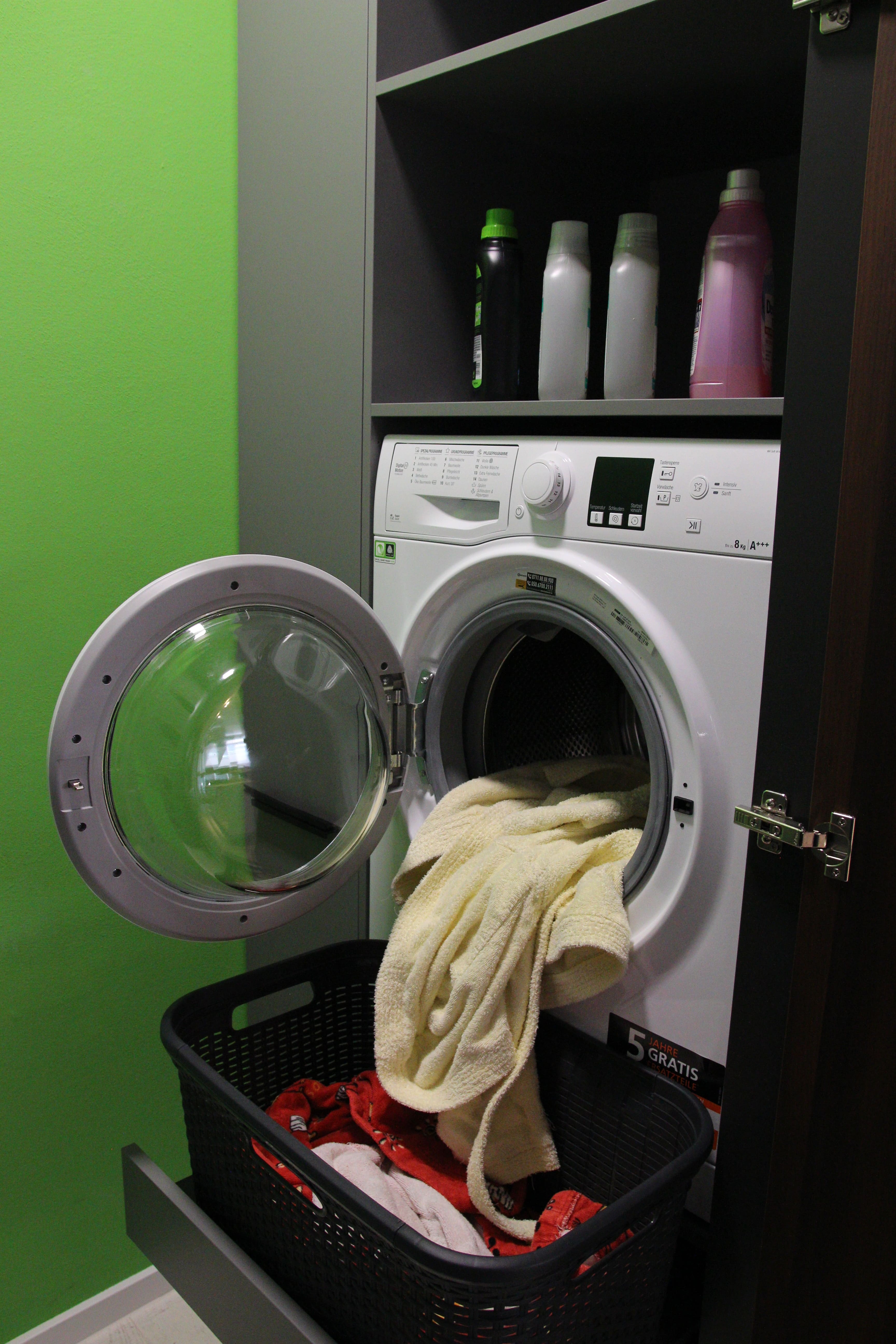 Ein weiteres Highlight ist der mit integrierte Haushaltsraum. Getarnt hinter einer Holzabdeckung bietet er Platz für eine Waschmaschine und hat zusätzlich jede Menge Platz für ihre Wäsche, Bügelbrett, Putzutensilien und vieles mehr.